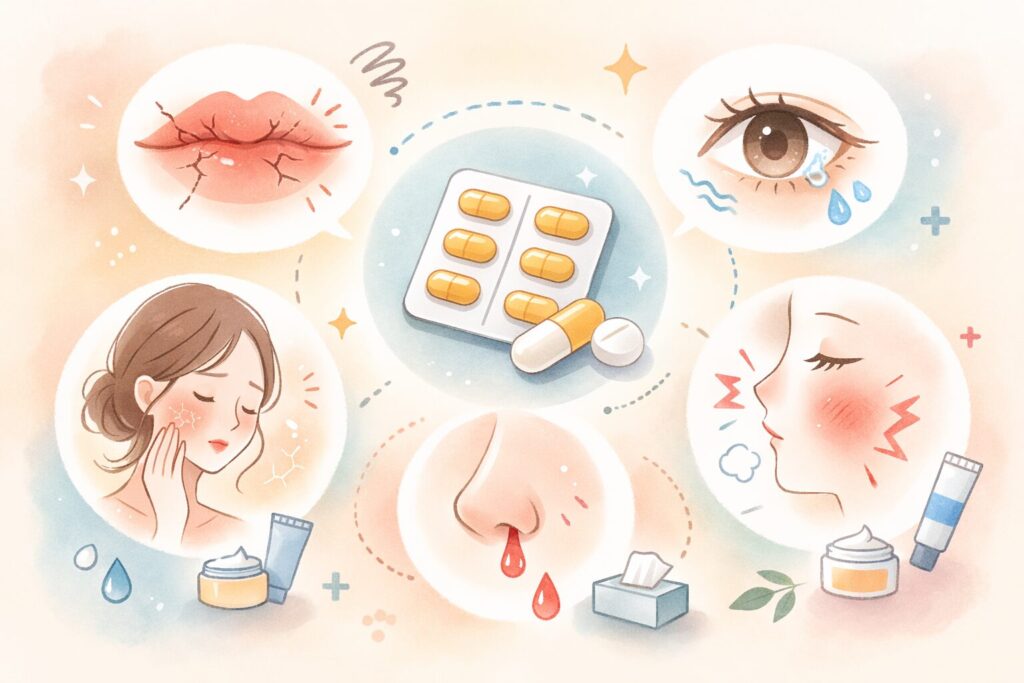 | 乾燥 | 肌や唇の乾燥・皮むけ、鼻の粘膜の乾燥、鼻血、目の乾き・まぶしさ |