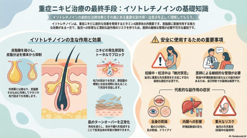 イソトレチノインは効果の高い薬ですが、副作用のリスクもあるため、必ず医師の管理のもとで治療を進めることが重要です。