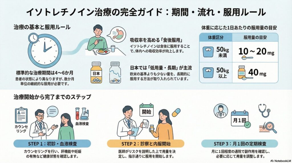 一般的なイソトレチノイン治療の期間は約4〜6か月とされています。