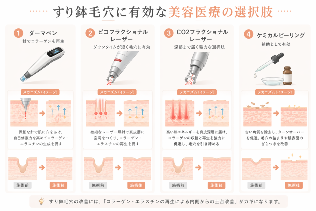 ここからが本題です。すり鉢毛穴の改善に有効とされている美容医療を、メカニズムとあわせて整理しました。