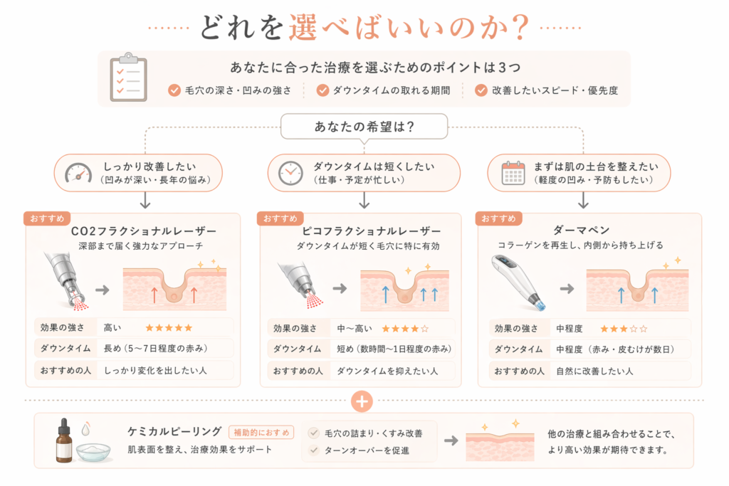 選ぶ際のポイントは「ダウンタイムをどこまで許容できるか」と「どんな悩みを優先したいか」です。
