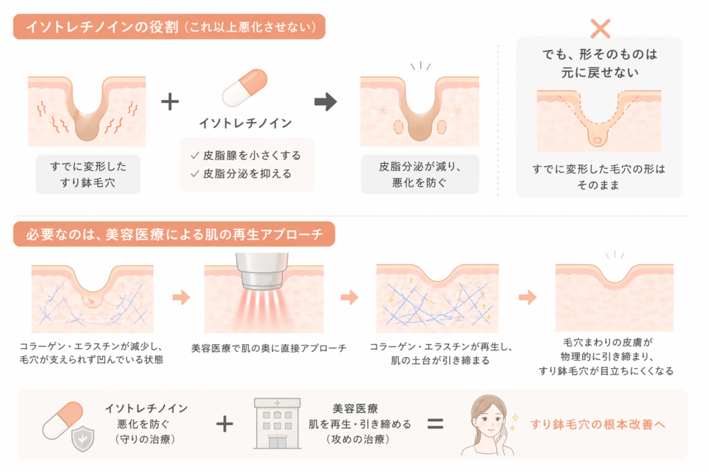 - イソトレチノインは「悪化を止める」役割。変形した毛穴を戻す力はない