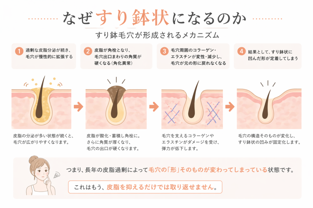 すり鉢毛穴が形成されるメカニズムは以下のように説明されています。