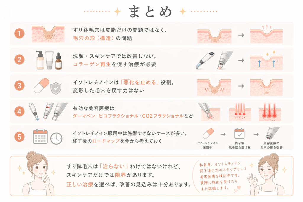 私自身は、イソトレチノインを続ける中で「皮脂は改善できても、毛穴の“形”は別のアプローチが必要」ということに気づきました。